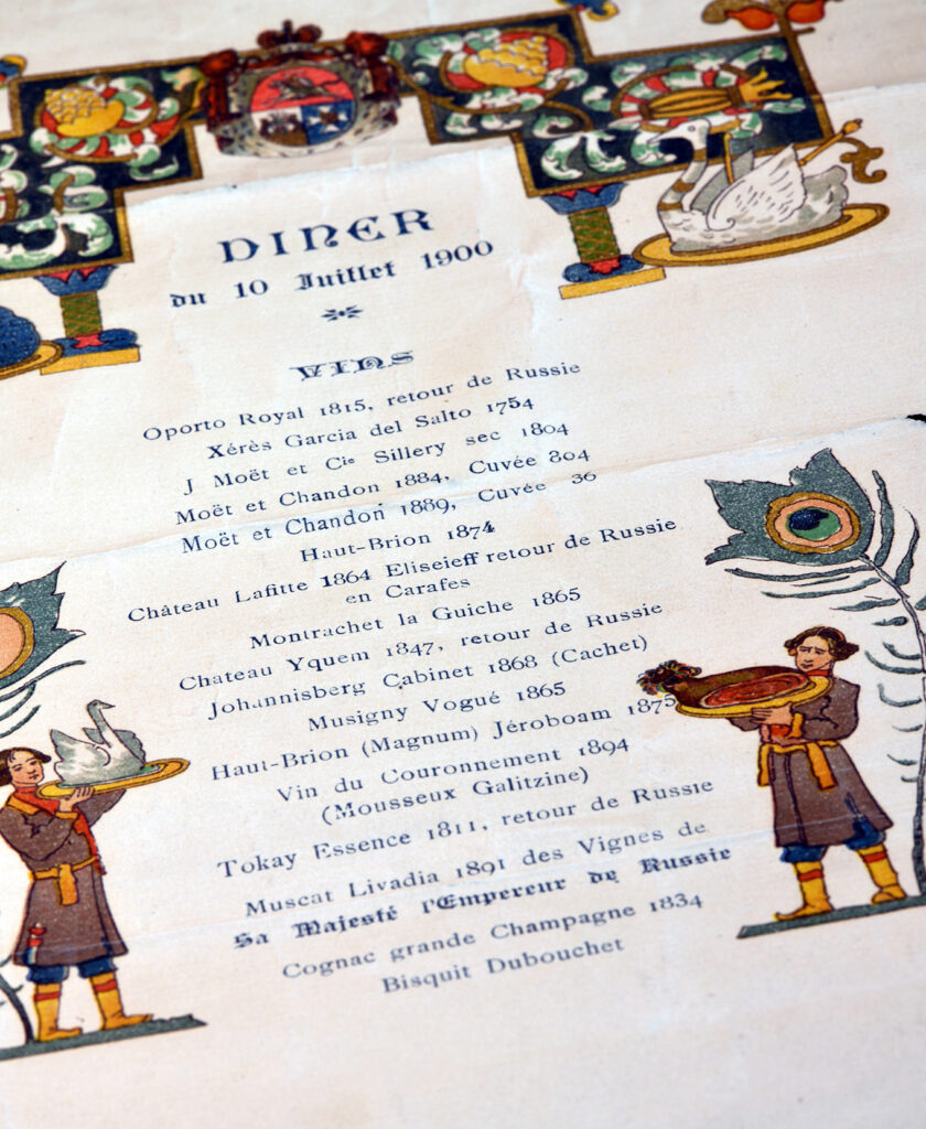 « Deux des livres du chef Antonin Carême signés de sa main, Le maître d’hôtel français et Le pâtissier pittoresque, ont été une première source d’inspiration qui allait devenir la pierre angulaire de la bibliothèque du Château Haut-Brion. Deux de mes tout premiers achats, ils représentaient l’histoire du monde, la gastronomie et, bien sûr, la diplomatie renommée de l’ancien propriétaire de Château Haut-Brion, Charles-Maurice de Talleyrand-Périgord. Je n’ai guère de doute quant au vin servi à sa table lors d’un congrès qui allait contribuer de manière significative à façonner l’Europe d’aujourd’hui ».